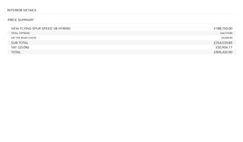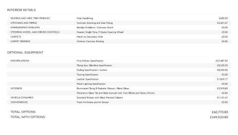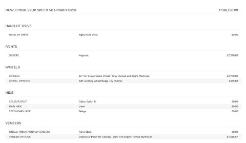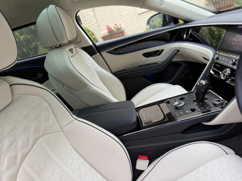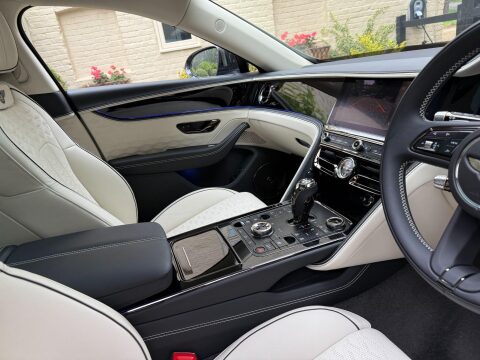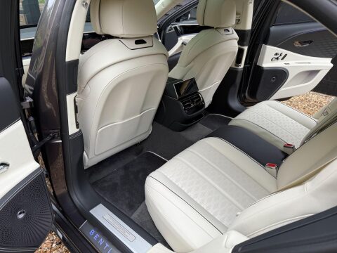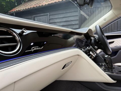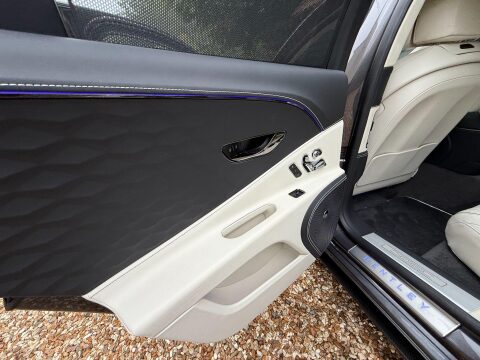 Cost options (£61,000!) and/or specification highlights to include: First Edition specification, Flying Spur blackline specification, carbon fibre styling specification, touring specification, leather specification, mood lighting specification, illuminated gloss black flying B mascot, large panoramic sliding sunroof, black brake callipers, extended hide headlining, 22 inch ten swept spoke grey over machined Speed wheels with self levelling centre caps electric climate controlled heated, cooled and massaging seats both front and rear with extended memory, soft close doors, power tailgate, keyless entry and drive, new gen touch screen navigation, digital cockpit, carplay and smartphone interface, adaptive air suspension, reversing camera with 360 surround view, traffic assist, adaptive radar cruise control, lane assist, blind spot monitors, pedestrian warning, night vision system, head up display, 4 zone climate control with rear tablet, electric rear blinds, double glazing, rotating dash, NAIM for Bentley audio, heated hide steering wheel, Bentley dynamic ride plus all standard and expected refinements at £305,000 new.